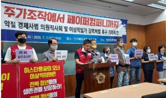 이들 단체는 기자회견에서 "1,600명의 이스타항공 노동자들이 무려 250억원에 이르는 임금 체불과 일방적 구조조정으로 고통을 받고 있는데도, 이스타항공의 실소유주이자 전북을 연고로 한 이상직 위원은 눈가리고 아웅하는 식으로 일관하고 있다"고 비판했다.