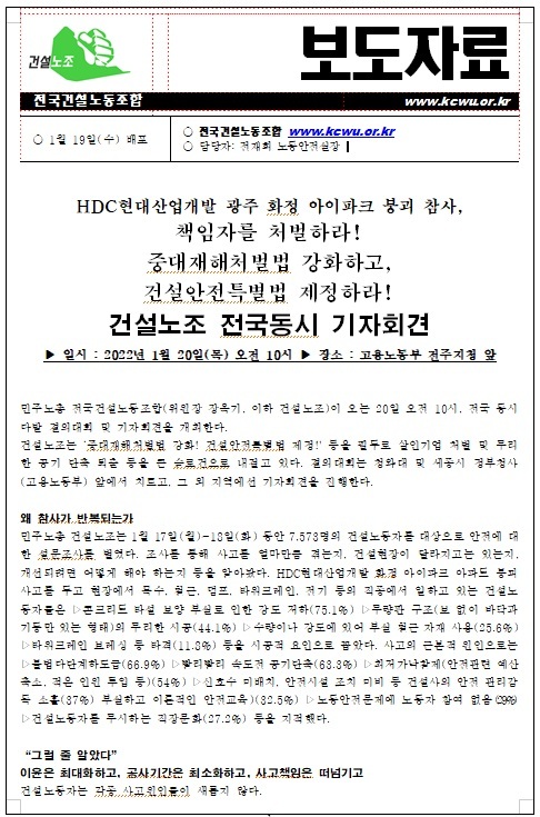 이들은 최근 광주시 HDC현대산업개발 화정 아이파크 아파트 붕괴 사고와 관련, "살인기업 처벌 및 무리한 공기 단축 퇴출"을 요구하면서 건설현장의 주된 참사 원인과 제도적 문제점 등을 공개했다. 다음은 이날 건설노조가 밝힌 참사 원인과 문제점, 기자회견문 전문 내용이다.