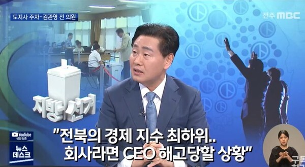 그는 특히 ”전북의 경제력 지수가 전국 최하위“라며 ”회사 같으면 CEO가 해고당할 상황인데 똑같은 인물 똑같은 지방정부와 방식으로 그동안 8년을 넘어서 12년이 계속된다면 대단히 암울한 상황이 올 것이라 생각한다“고 우회적으로 현 송 지사 체제를 비판했다.