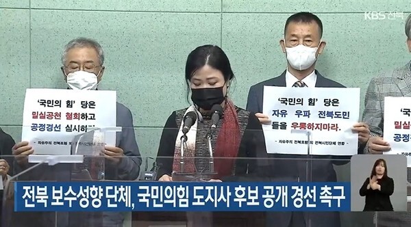 자유주의 전북포럼 등 15개 단체로 구성된 이들 단체는 이날 전북도의회에서 기자회견을 갖고 "국민의힘 이준석 대표와 정운천 전북도당위원장이 비공개 후보였던 조배숙 전 민주당 의원을 전북도지사 후보로 밀실에서 단순 공천한 것은 공정한 경선 과정을 무시한 것"이라며 "공개경선을 통해 국민의힘 위상을 높이는 과정을 기대하고 있던 도민들과 지역 여론의 기대를 처참하게 무산시켰다"고 비판했다.