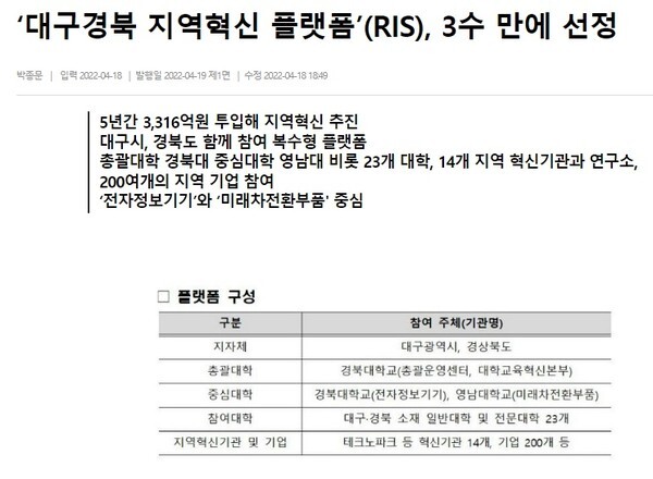 RIS사업은 학령인구 감소, 지역인재 수도권 유출 등으로 인한 지역소멸 위기를 극복하기 위해 지자체와 대학이 협업체계를 구축해 지역에서 필요로 하는 인재를 양성하고, 지역발전 생태계를 조성할 수 있도록 지원하는 사업으로 2022년 6개 플랫폼을 지원하는 예산에는 국비 2,440억원과 지방비 1,045억원 등 약 3,485억원이 투입되는 대규모 지원사업이다.