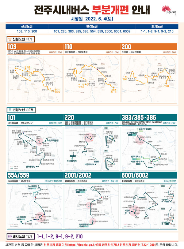 6월부터 적용되고 있는 전주시 시내버스 노선개편으로 인해 103번과 110번, 200번 등 3개 노선이 신설됐고, 101번과 2000번, 6001·6002번, 554·559번, 220번, 383번, 385·386번 등 총 10개 노선의 일부 경유지가 변경됐다. 그러나 신설 노선과 중복되는 기존 1-1번, 1-2번, 9-1번, 9-2번, 210번 등 5개 노선은 폐지됐다.