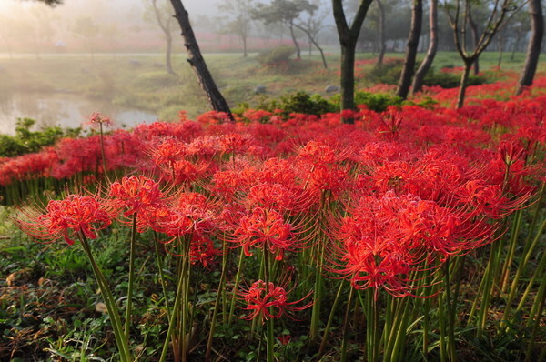 고창 선운산 계곡 깊숙이 레드카펫이 깔렸다. 가느다란 꽃줄기 위로 여러 장의 빨간 꽃잎이 한데 모여 말아 올린 자태가 빨간 우산을 펼친 것만 같다. 살펴주는 이 아무도 없어도 꽃들은 수수하게 잘도 피었다.