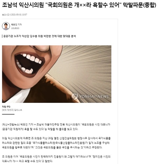 기사는 “익산의 더불어민주당 시의원이 자신의 지역구 민주당 국회의원을 공공기관 노조가 ‘갑질’하지 말라고 비판한 데 대해 노조를 겨냥 ‘일개 노조가 국회의원을 함부로 대했다’면서 ‘국회의원은 시민 대표니까(공공기관 직원에게) 개××라고 욕을 할 수도 있다’고 막말해 물의를 빚고 있다”고 상세히 보도했다.