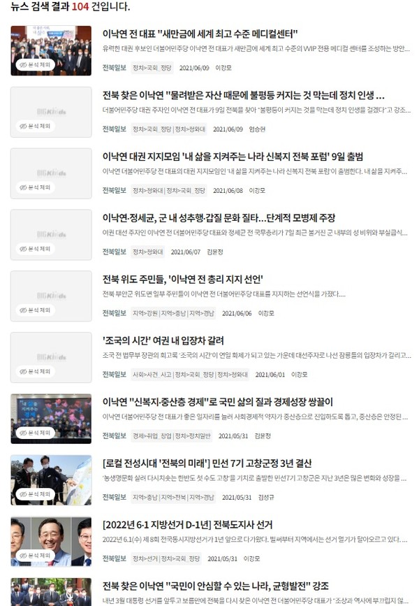 한국언론진흥재단이 운영하는 뉴스 빅데이터 분석 시스템인 '빅카인즈(BIGKINDS') 서비스를 활용한 뉴스 검색을 실시한 결과, 올 1월 1일부터 6월 10일(오전 6시 기준)까지 '이낙연' 전 대표와 관련된 검색 기사는 모두 104건으로 나타났다. 이 기간에 전북일보 자사 홈페이지 상세검색 기능에서 검색된 관련 기사 건수도 108건으로 나타나 큰 차이를 보이지 않았다.