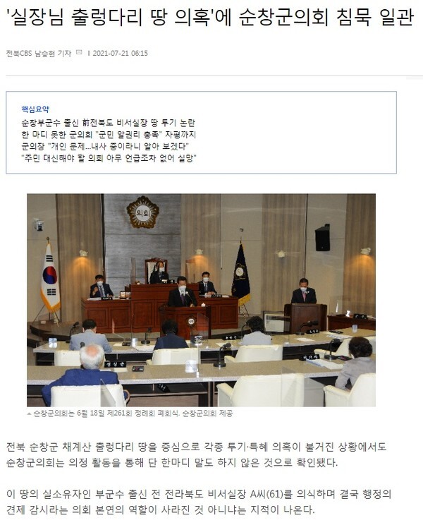 이어 기사는 “순창군의회는 지난 6월 9일부터 18일까지 열흘간 제261회 정례회를 통해 군정 주요사업 실태조사를 비롯해 군정질문과 조례안을 심의했다”며 “그러나 이와 관련해 의회에서는 군정질문 등을 통한 기회가 있었지만, 단 한 차례도 언급하지 않았다”고 보도했다.