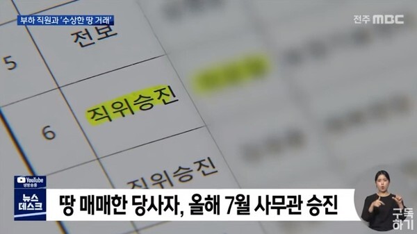 방송은 이날 기사에서 “장 군수는 지난해 특이하게도 군청 직원에게서 땅을 사 집을 지었는데 문제는 장 군수가 시세보다 낮은 가격에 땅을 샀다는 의혹이 일고 있는데 땅을 판 공무원은 서열까지 뒤집고 과장으로 승진했다”고 리드에서 밝혔다.