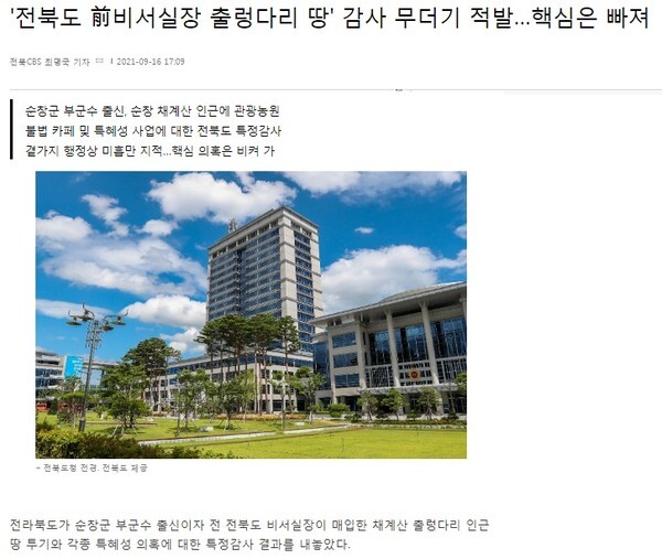 “전북도 감사실이 지난 몇 달 동안 진행한 감사 결과를 밝혔는데 상당수의 의혹이 사실로 밝혀져 파문이 커지고 있다”는 기사는 “순창군 부군수를 거쳐 전북도청 비서실장으로 지난 2019년 7월 퇴임한 전직 간부가 부군수 재직 당시 추진한 관광농원이 명목은 관광농원이지만 필수요건인 영농체험 시설은 거의 찾아볼 수 없어 관광객을 상대로 한 카페 운영을 위한 편법이 의심된다”고 밝혔다.