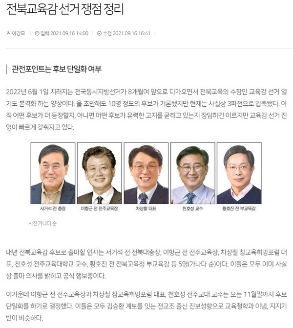 이어 “이 가운데 이항근 전 전주교육장과 차상철 참교육희망포럼 대표, 천호성 전주교대 교수는 오는 11월말까지 후보 단일화를 하기로 결정했다”는 기사는 “이들은 모두 김승환 계보를 잇는 전교조 출신 진보성향으로 교육철학과 이념, 지지기반이 비슷하다”고 평가했다.