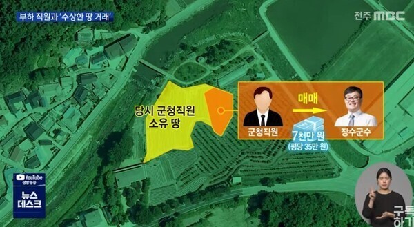 이날 방송된 보도에 따르면 4년 전 시세보다 훨씬 비싼 가격에 땅을 산 장 군수는 매매 당일 장수농협로부터 과도한 대출이 이뤄진데다 허위 계약을 의심할 만한 정황이 발견돼 의혹이 시선을 받고 있다.