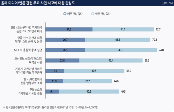 2021년 미디어 및 언론 분야 사건·사고에 대한 심각성 인식을 조사한 결과, ‘매우 심각하다’는 답을 기준으로 ▲SBS <조선구마사> 논란(53.2%), ▲MBC 올림픽 중계 실언(48.1%), ▲안산에 대한 페미니스트 논란(40.9%), ▲조선일보 일러스트 부적절 사용(39.2%), ▲ABC협회 신문 발행부수 조작(30.9%), ▲‘기레기’ 아카이빙 사이트 기자 개인정보 무단공개(27.0%), ▲연합뉴스 기사형광고 포털 전송(25.2%) 순으로 나타났다.