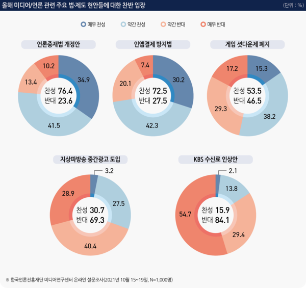 올해의 법·제도 이슈 5개 가운데 찬성 비율이 가장 높았던 것은 ‘언론중재법 개정안’으로, 4명 중 3명꼴인 76.4%에 이르렀다. 또한 ‘매우 찬성한다’(34.9%)는 의견이 ‘매우 반대한다’(10.2%)는 의견 대비 3배 이상 많은 것으로 나타났다.