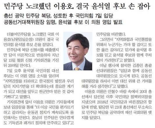 기사는 또 “이 의원은 21대 총선에서 무소속 당선된 직후인 지난해 4월부터 민주당 복당을 시도해 왔으나, 석연치 않은 이유로 수차례 복당이 거부됐다”며 “지난달에는 이 의원과 윤 후보와 조찬 회동을 한 뒤 복당 신청 자체를 취소하면서 국민의힘 합류 관측이 나왔다”고 전했다.