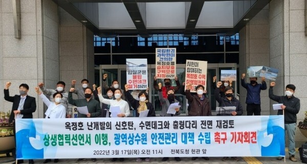 이들 단체는 "정읍시민은 옥정호뿐 아니라 동진강(도원천) 물을 식수원으로 사용하고 있다"며 "동진강 주변의 많은 축사에서 발생하는 오염물과 농경지의 잔류 농약 등 비점 오염물이 정읍지역 식수에 더 악영향을 끼칠 수 있다"고 주장했다.