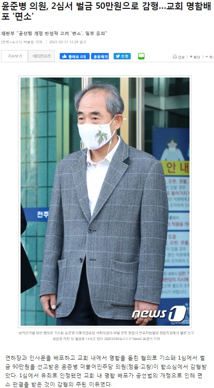 전북지역에선 이원택 의원에 이어 연하장과 인사문을 배포하고 교회 내에서 명함을 돌린 혐의로 기소돼 1심에서 벌금 90만원을 선고받은 윤준병 더불어민주당 국회의원(정읍·고창)이 항소심에서 감형을 선고받았다. 1심에서 유죄로 인정됐던 교회 내 명함 배포가 공선법의 개정으로 인해 면소 판결을 받은 것이 감형의 주된 이유였다.