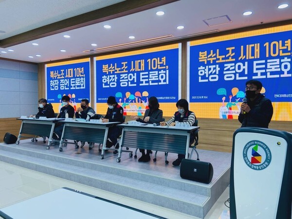 박두영 민주노총전북본부장은 토론에 앞서 “2011년 7월 1일, 사업 또는 사업장단위 복수노조 제도가 시행된 지 올해로 꼭 10년이 되었다”며 “사업장 내 복수의 노동조합 금지하는 행위는 국제기준에도 맞지 않을뿐더러 명백한 노동탄압이었다”고 말했다.